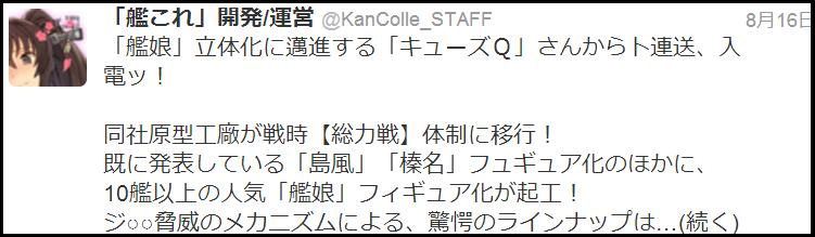 【艦これフィギュア】艦隊コレクション ミニッチュ フィギュアニュース 2013年08月21日 ファットカンパニーさんより、『艦これ』のフィギュア化が発表されました。デフォルメされた絵から、『ミニッチュシリーズ』で発売されるようです。 画像の3人は、「赤城」「島風」「榛名」でしょうか。 『ミニッチュシリーズ』で3体のみ発売というのは考えにくいので、他のキャラも今後発表されていくのではないかと。